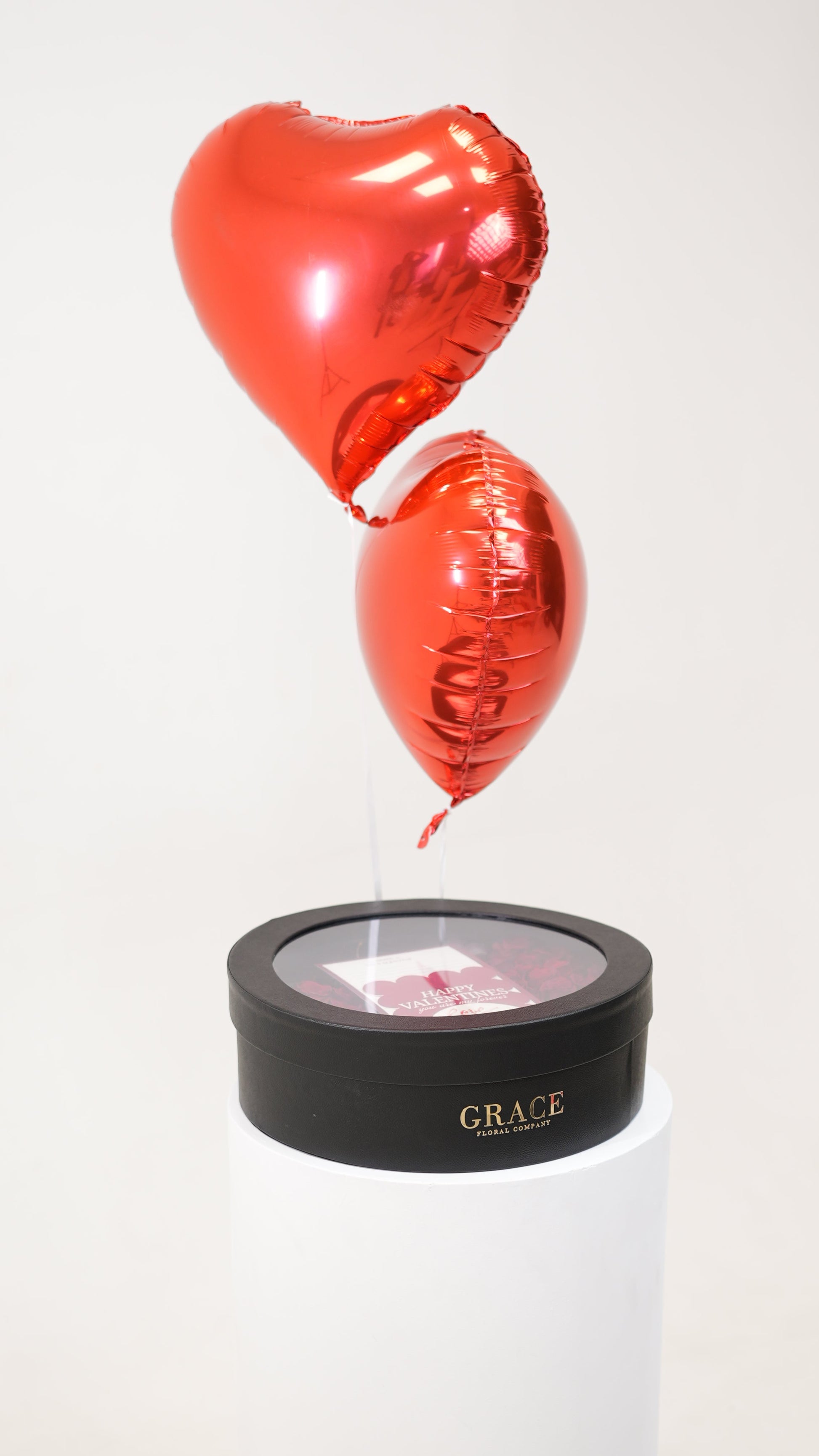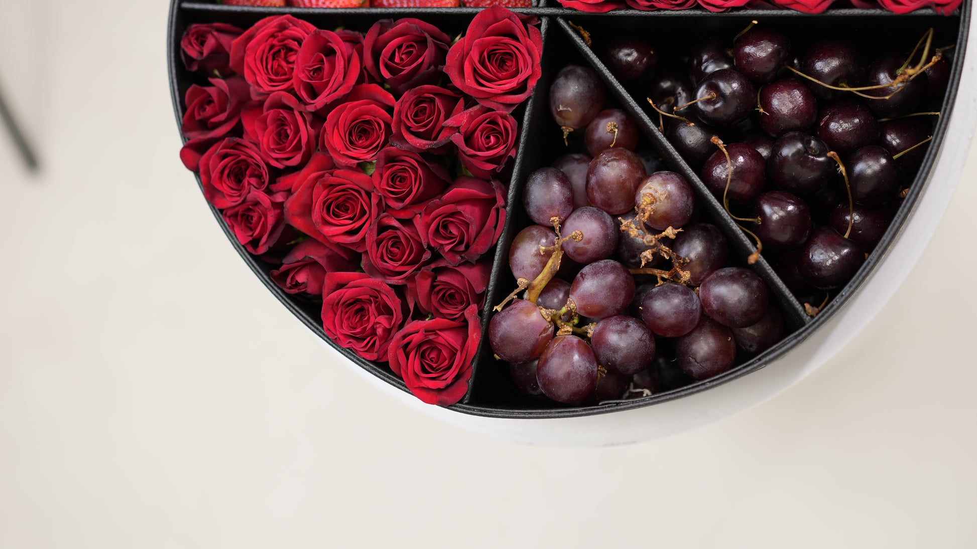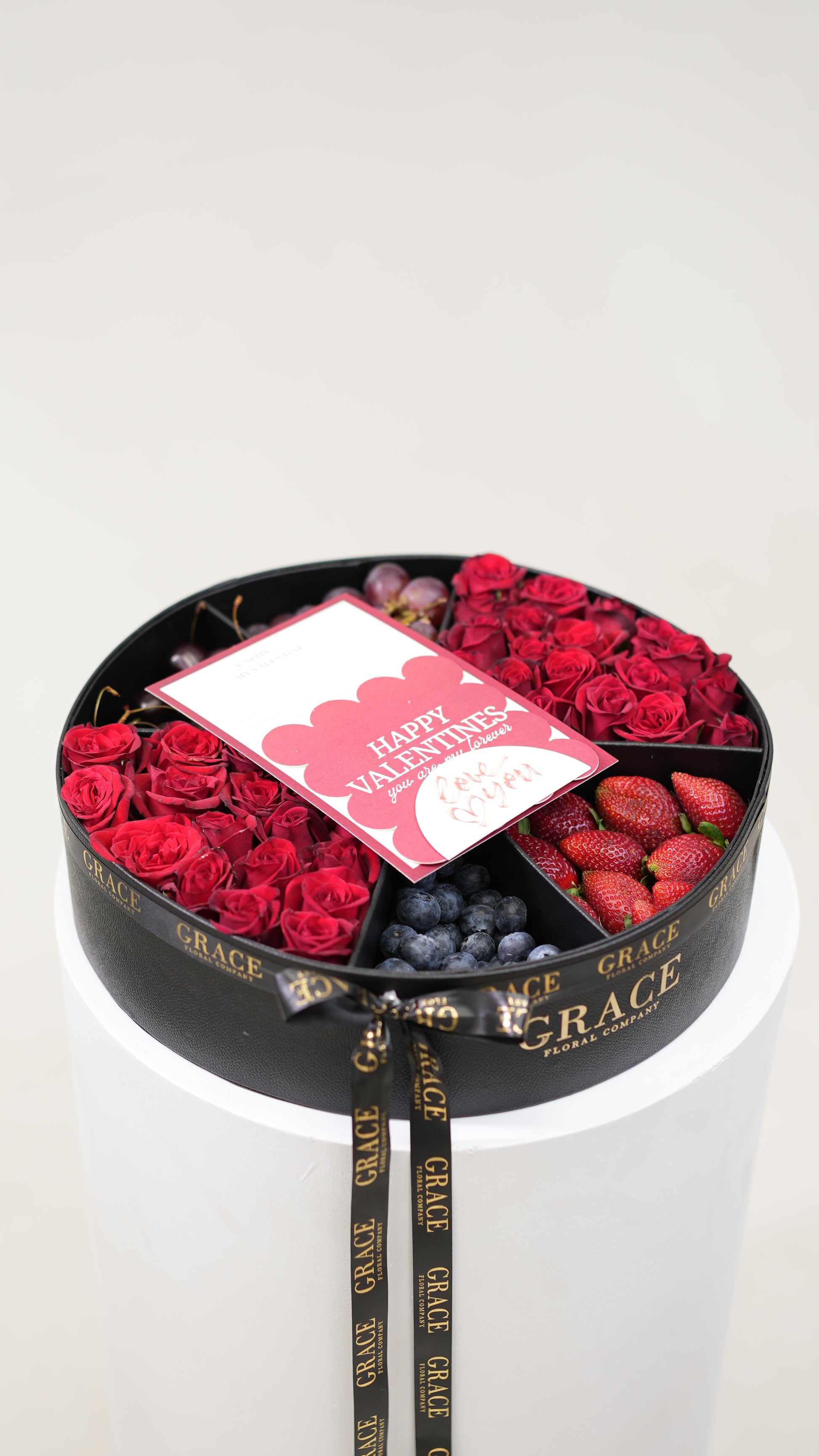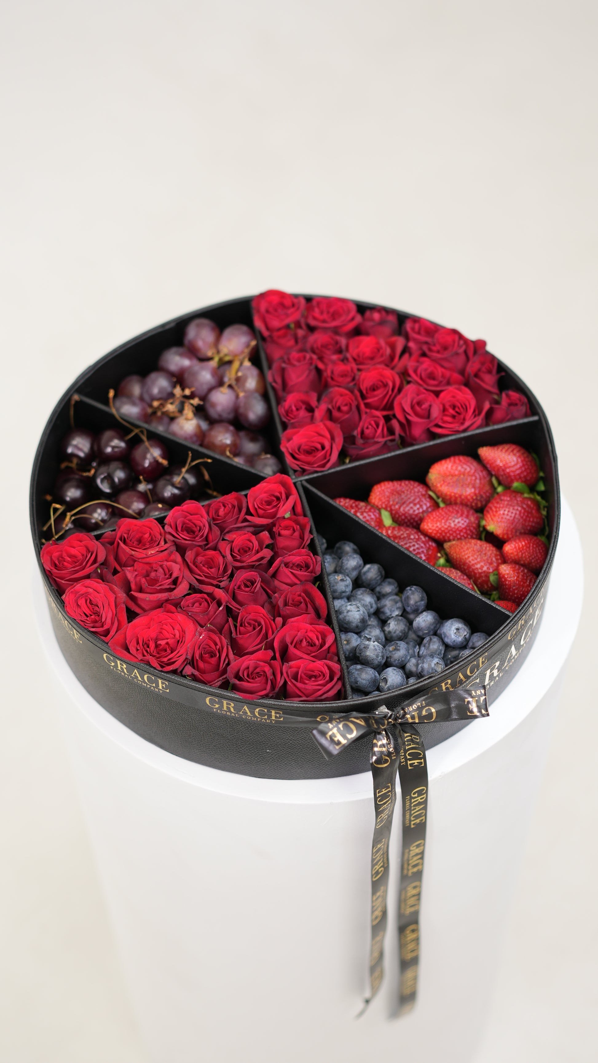 This circular Grace box brings together rich red roses with fresh fruits: blueberries, strawberries, cherries, and red grapes arranged with balance and intention.